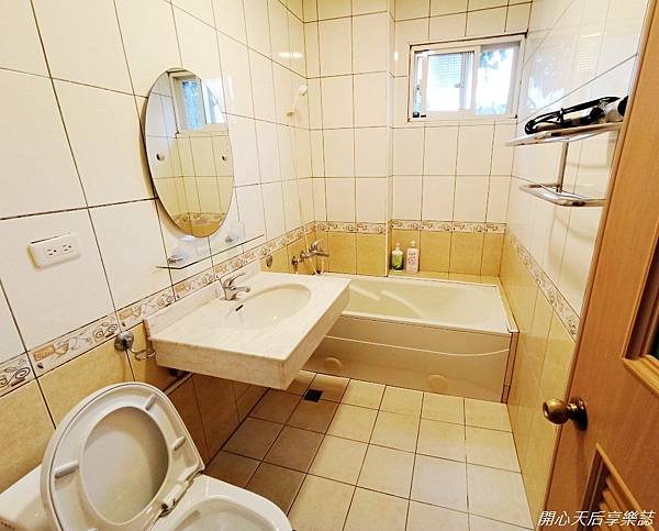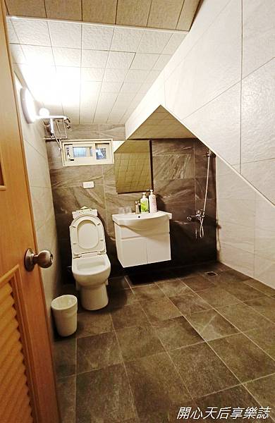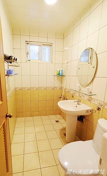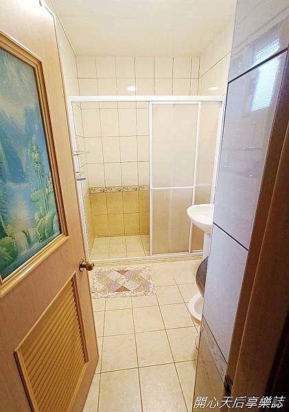 浴室空間不小,架上擺有吹風機,淋浴間前舖有日式拼布地墊,每間浴室的日式拼布地墊圖案都不同,可見民宿主人的用心