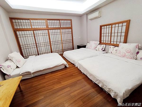 和室木地板上擺放3張雙人床,對於小小孩來說很安全,可以放心讓小小孩在木地板上玩耍