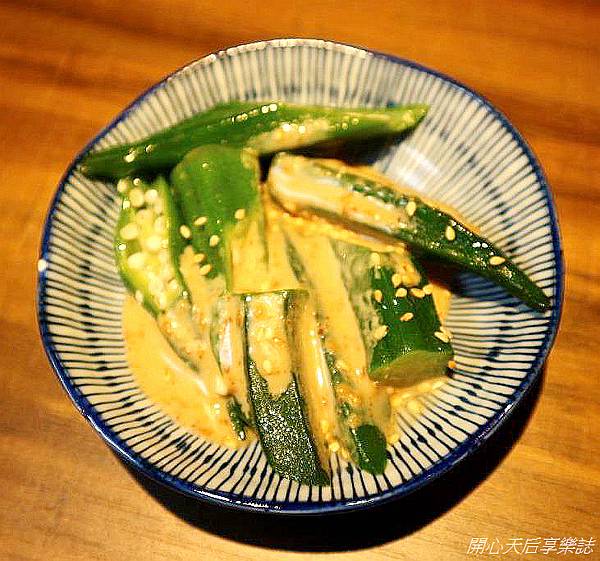 開胃小菜2選1<胡麻秋葵>川燙後的秋葵淋上胡麻醬,吃起來滑順脆口,口中充滿香郁的胡麻味