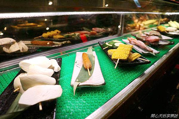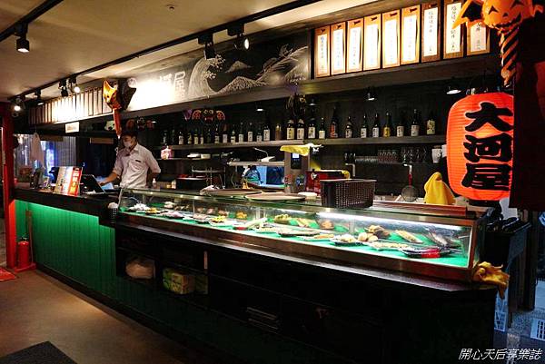 『大河屋-板橋遠百店』具有日本料理店的長型料理台,玻璃櫥櫃裏還擺了不少燒烤食材
