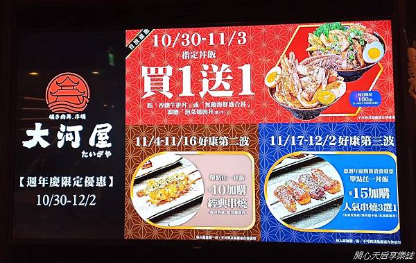 『大河屋-板橋遠百店』除了一般菜單外,也有<派對分享組合>菜單,推出2、3、4人套餐,自由搭配限定丼飯、串燒蔬食、鍋物料理,若是單點丼飯可加價$98,升級套餐(含沙拉/甜點/飲料),還有兒童餐、生啤酒無限暢飲$298,好優惠!