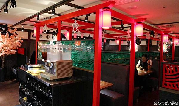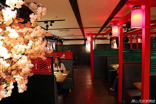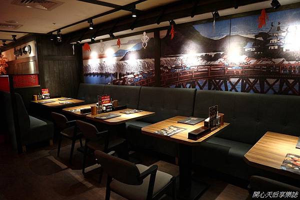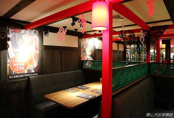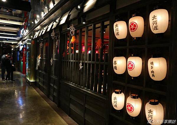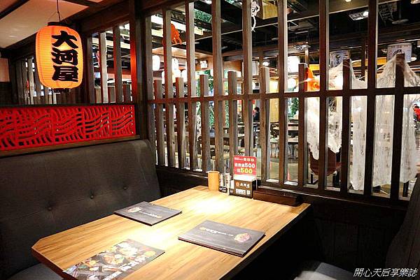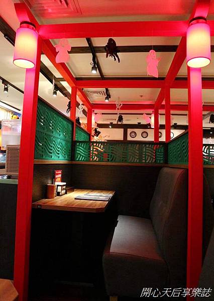 『大河屋-板橋遠百店』有著大量木製柵欄裝飾,傳統薰木裝潢並掛滿懷舊紅燈籠點綴搭,搭配特有的燈光擺飾,充滿日式屋台情境,沒辦法去日本,來這裡也能感受到道地日本氛圍,加上西洋萬聖節的應景裝飾,增添不少童趣!