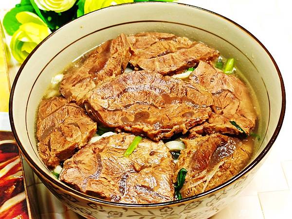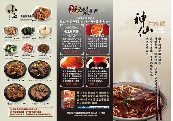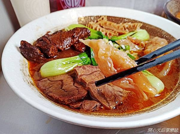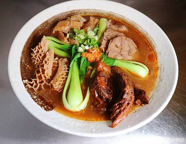 含有牛腩、牛肚、牛筋、牛腱、手工拉麵、青江菜及一小撮神仙辣椒醬