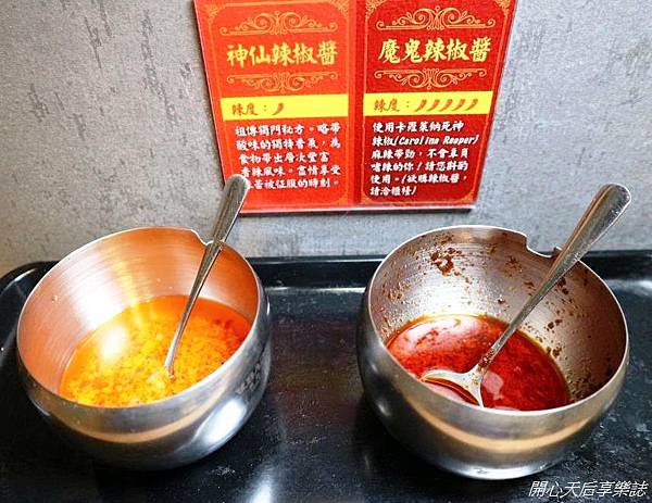 提供2種獨家自製的辣椒醬~神仙辣椒醬(香而不麻,中辣)/魔鬼辣椒醬(非常辣,小心嘗試)