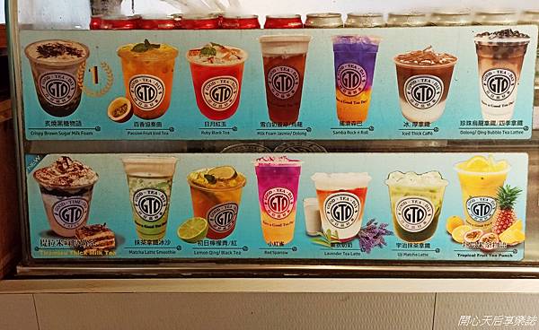 冷藏櫃外貼有隔壁姐妹店『GTD手搖飲』的招牌飲料圖片,每桌也都有擺放飲料MENU