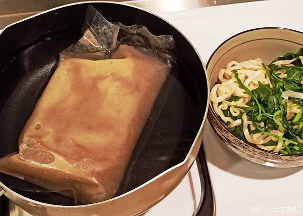 隔水加熱牛肉湯調理包後,等夠熱時,再將湯倒入一旁備用麵、菜碗裏