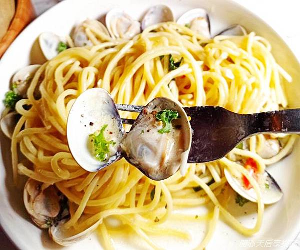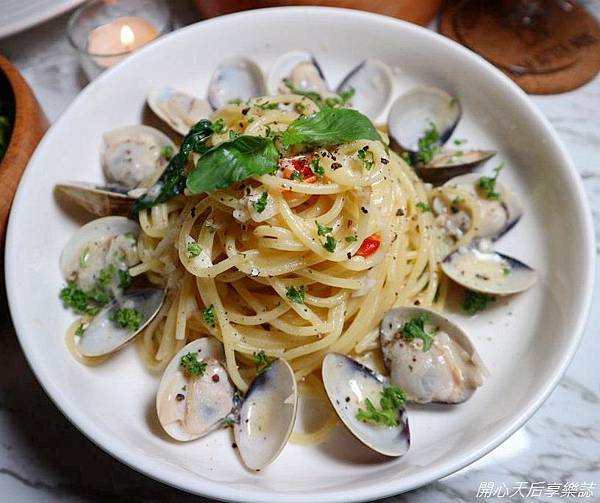 白酒蛤蜊義大利麵套餐$499(含羅宋湯,前菜三選一),擺盤不同於一般的單調,而是像盛開的花朵