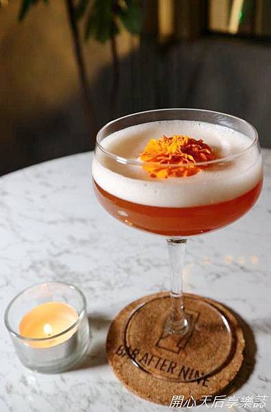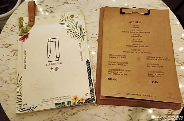 『BAR AFTER NINE九後』有中西餐點、調酒、清酒、紅/白酒、威士忌等酒類可選擇,而且調酒名稱都蠻別出心裁的菜單酒單