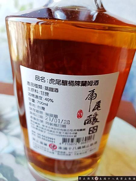 『虎尾釀-桶陳蘭姆酒』瓶身背面有清楚的產品相關標示