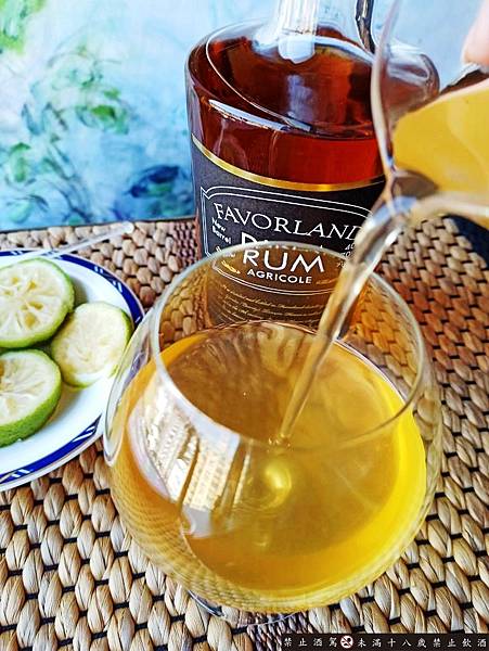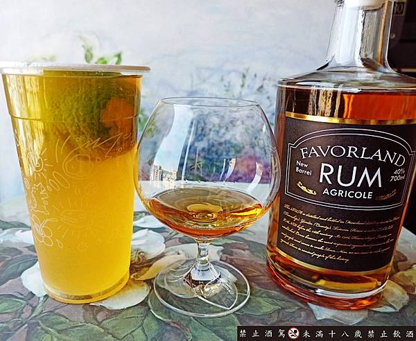 先買好去冰、全糖的檸檬茶手搖杯,隨意在酒杯中倒入些許『虎尾釀-桶陳蘭姆酒』