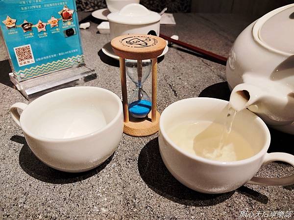 我們一坐定,服務人員立即送上阿里山高山烏龍茶及沙漏,等沙子漏下後 ,即可品茗