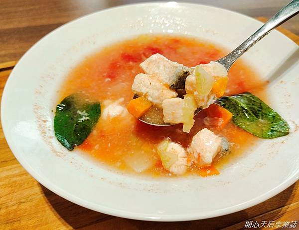 義式蕃茄海鮮湯$120,內含鮭魚、蝦肉及不少蕃茄、胡蘿蔔,也加了芹菜、九層塔,酸甜開胃