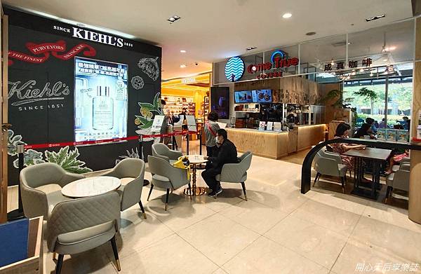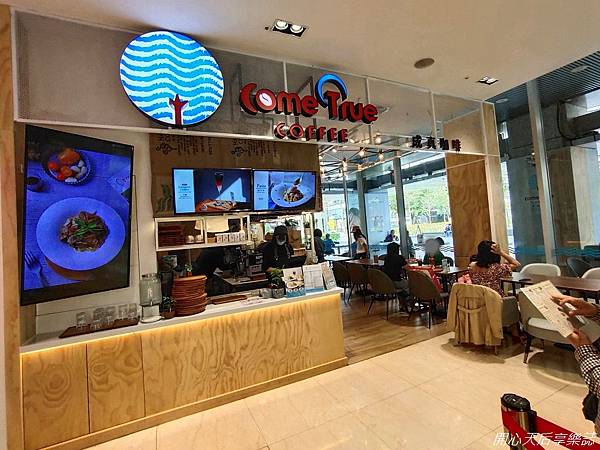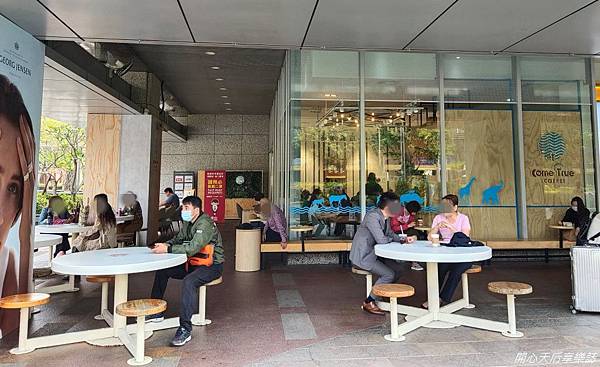 和閨蜜來到『成真咖啡-台北SOGO天母店』,位在捷運芝山站附近、SOGO百貨天母店一樓邊間,一眼就看到『成真咖啡』藍白外觀,清新中帶有非洲草原氣息,藍白波浪紋路的夢想樹LOGO