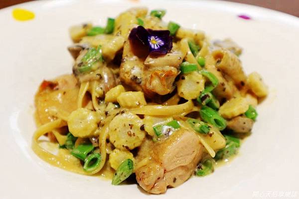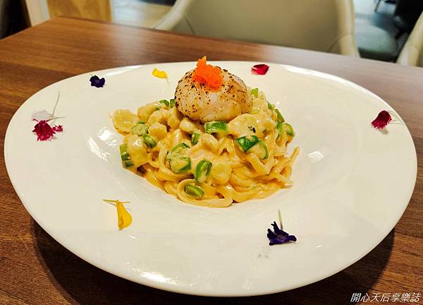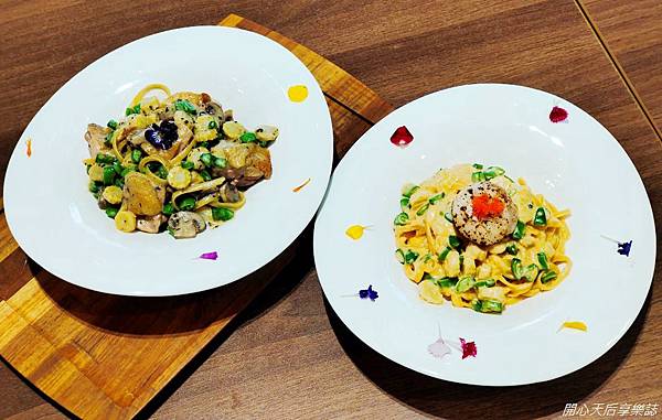 松露奶油雞、明太子干貝義大利麵以真花花瓣點綴擺盤,清新美麗,富有詩意