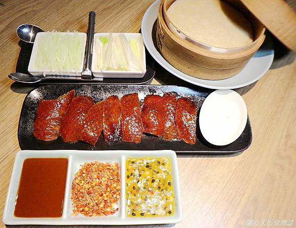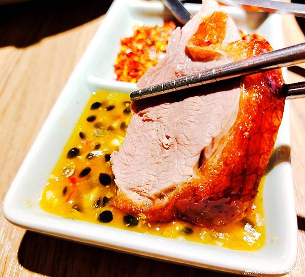 烤鴨皮脆、肉柔嫩,鮮甜多汁不乾柴,沾上富有濃郁果香的百香果醬,讓烤鴨肉口味層次更豐富,香甜中有著酸甜果味,吃起來比一般烤鴨爽口
