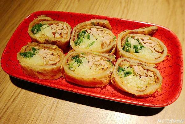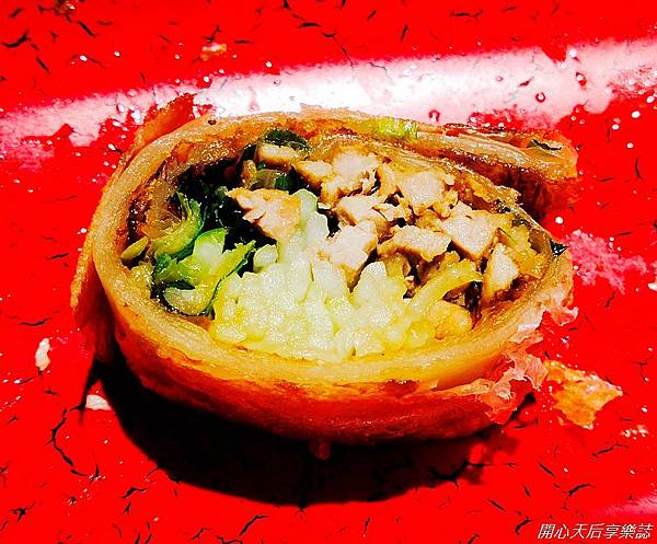 蔥餅捲鴨肉$180,酥厚蔥餅皮包裹著鴨肉、多種蔬菜,口味清甜,具有多層次清脆口感,好爽口