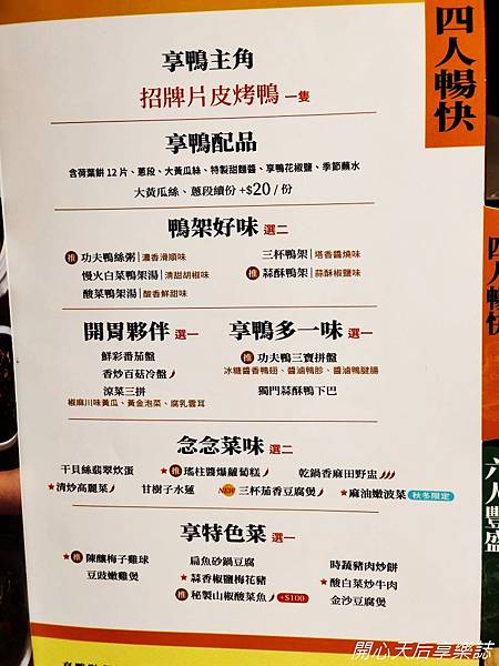 四人套餐含有招牌烤鴨一隻+配品、7菜(含有湯品),菜單上有2款標示,分別是"推薦"、"辣味",讓顧客方便選擇,不易有選擇障礙
