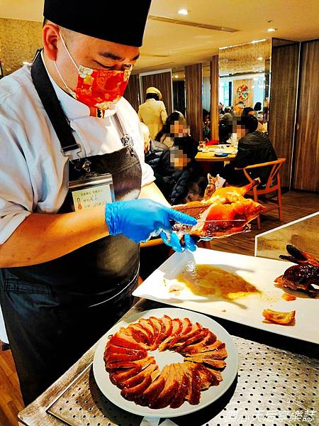 由刀功了得的師傅現場桌邊秀,俐落呈現「招牌片皮鴨三味吃法」