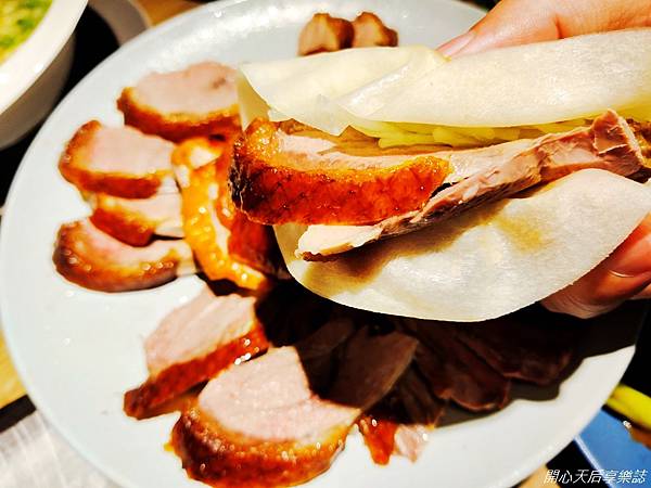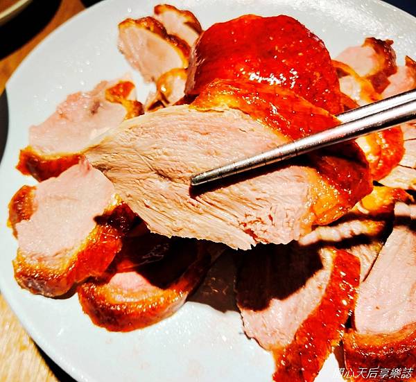一吃~白糖酥胸享口感,由酥脆的烤鴨胸上取下黃金8片鴨皮,入口酥脆,歸功於24小時的風乾,才能烤出如此酥香、薄脆的鴨皮