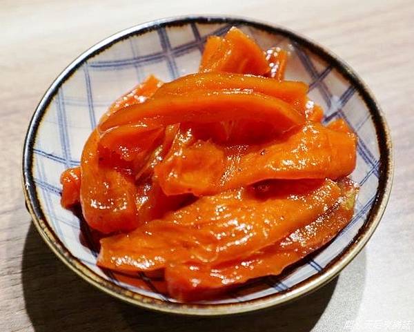 但我真的吃不出胡蘿蔔味,闆娘說為了做出這道小菜,花了很多時間試做、試吃、調整,才做出吃起來完全沒有胡蘿蔔味的蜜蘿蔔,只為了要讓怕吃胡蘿蔔的客人能放心享用這道厚工的小菜