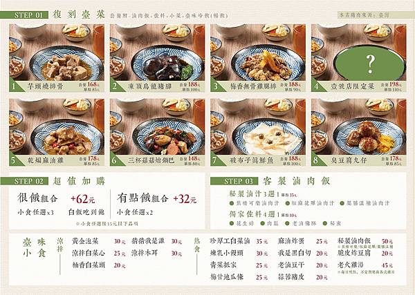 菜單主要以招牌滷肉飯搭配知名台菜的套餐為主,再搭配單點多種古早味小菜/湯,價位都是親民的銅板價