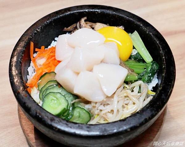 北海道干貝蟹膏石鍋拌飯,燒熱的石鍋中加入北海道干貝、韓國蟹膏、豆芽、胡蘿蔔生雞蛋等食材,由服務人員攪拌均勻,攪拌時香氣四溢,讓我迫不及待想開吃