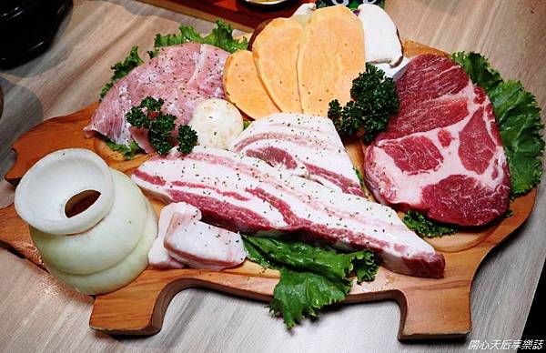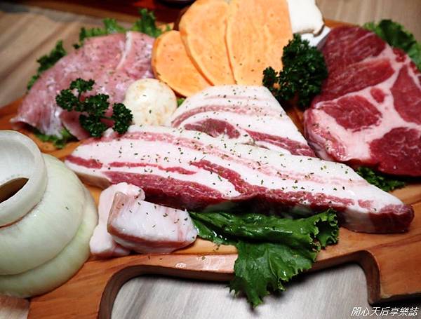 懶得想就點這一盤1299元,豬仔造型的木盤上有三種頂級豬肉,色澤及油花都好美,看起來好引誘人流口水啊