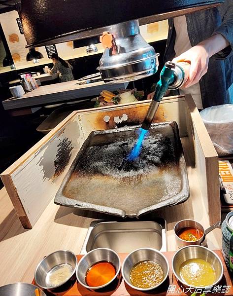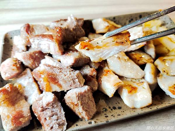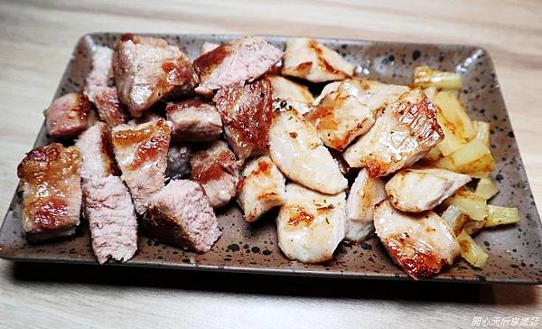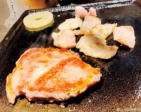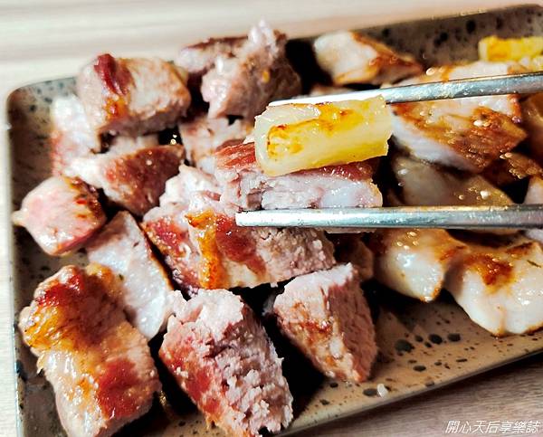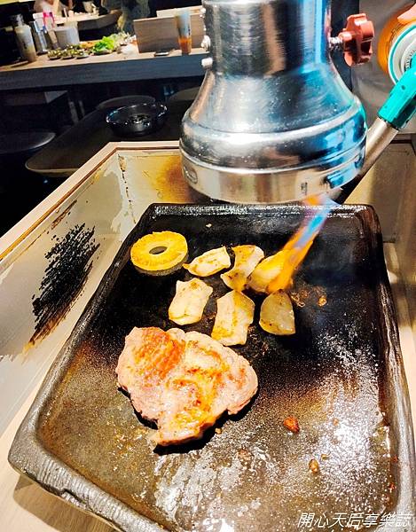 接著烤盤克夏豬梅花、究好松阪豬、鳯梨片,除了烤以外,也加上炙燒,可以讓肉品味道、口感變得更加豐富,並引出更豐富的油脂