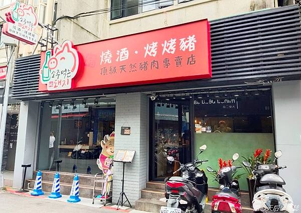 『燒酒・烤烤豬』的招牌很可愛是豬豬拿著韓國燒酒,好像對著路人說:來吃燒肉、來喝燒酒呦!