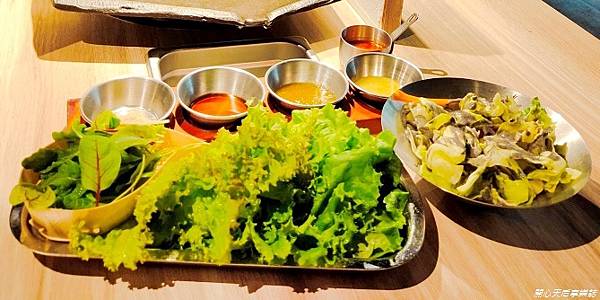 等待烤肉時,我先吃芝麻醬生菜沙拉(右),來開胃止飢一下