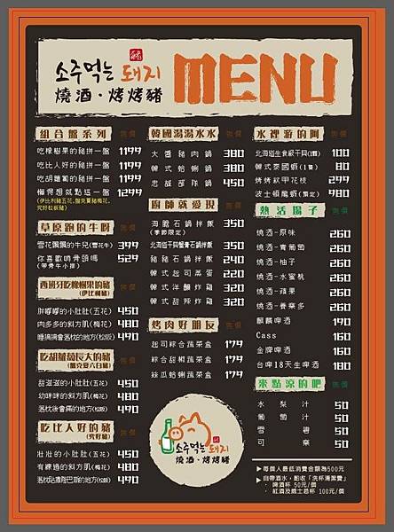 『燒酒・烤烤豬』菜單,餐點名稱好幽默,讓人看了會心一笑