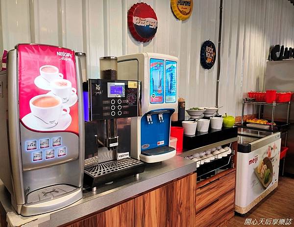 冷熱飲區,選擇也多,有研磨咖啡機,還有奶茶、茶飲機等