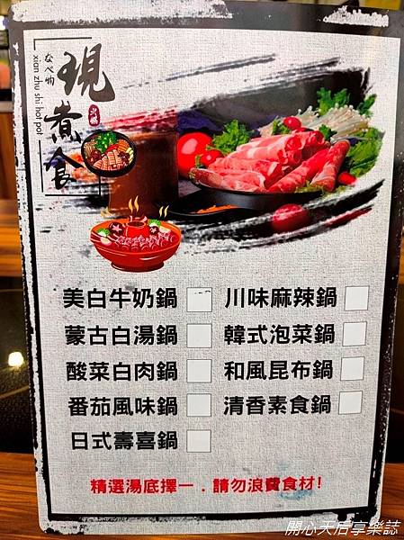 『現煮食麻辣鴛鴦火鍋』採用鴛鴦鍋,目前有九種湯底 ,一桌四人可以選擇四種湯底