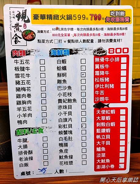 這次我們吃價位$799,可以點全部的品項,尤其是紅色區的高級肉品、海鮮,像是無骨牛小排、翼板牛、牛舌、天使紅蝦、藍鑽蝦、伊比利豬、松板豬、帆立貝、大干貝等
