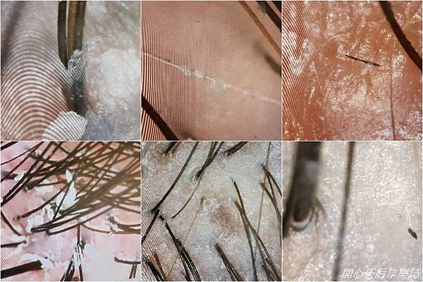 發現我的頭皮因為出油,毛囊有嚴重阻塞、脫屑的現象,也發現頭皮上有幾處黑點,竟然是黑色素沉澱,還有頭髮被細菌啃蝕後的斷髮及髮量變少、髮根白化等問題