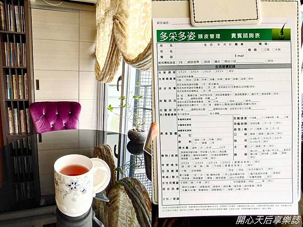 坐定後,服務人員立即送上南非國寶茶及諮詢表,並為我介紹「頭皮健康環境重建護理」課程~約2.5小時,主要流程:1.諮詢 2.檢測 3.辨症 4.管理 5.改善