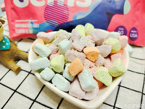 外包裝及裏面的彩色石頭棉花糖看起來一樣繽紛誘人,而且還是"脆"的棉花糖,看了就很想嗑起來!