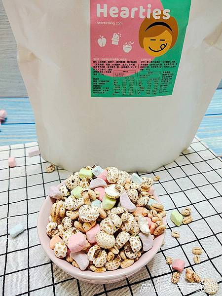 收到有著繽紛色彩的『Hearties 石頭棉花糖.五彩脆薏仁核桐麥』,看了心情好好喔!恩恩一看到就搶著要開吃;『Hearties』於2017年夏天由KK&JJ夫妻檔成立,Hearties是hearty bites的縮寫,hearty指有飽足或滿足感,bites指的是小點心,意指讓人吃了會滿足的小點心!
