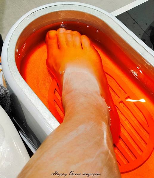 並以蜜蠟保濕熱導入,足部電熱套敷腳15分鐘,溫溫熱熱的,讓疲勞的雙腳感覺好舒暢