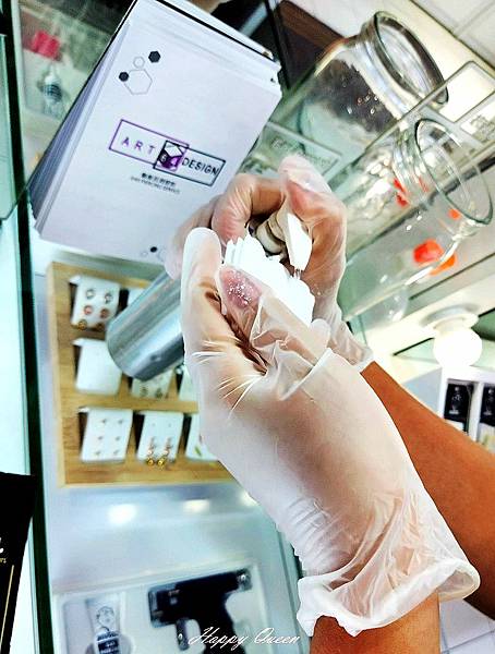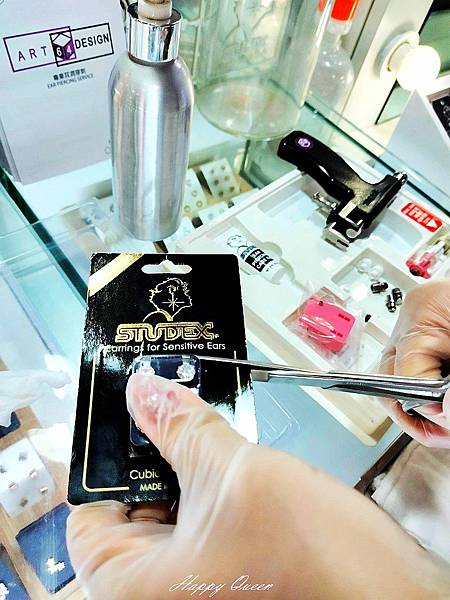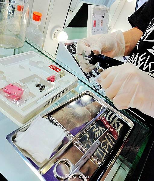 穿耳洞前,正妹店員開始準備工作,先配戴隔離手套,再充分消毒美國品牌STUDEX專業穿耳洞器材等,嚴格執行消毒與衛生防護措施,確保顧客擁有安全健康的穿刺環境,讓我很安心