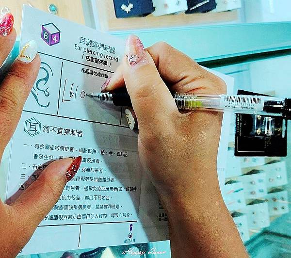搓熱雙耳後,正妹店員接著用筆在我的雙耳標明待會要穿刺的位置