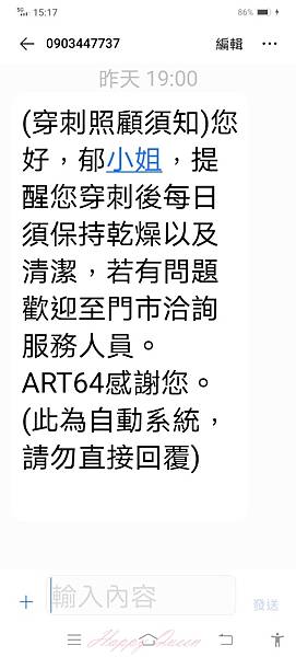 穿耳洞一周後,收到『ART64 DESIGN』的簡訊提醒,我對於『ART64 DESIGN 新北永和旗艦店』超專業、超貼心的耳洞穿刺服務,感到非常滿意!