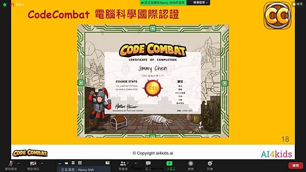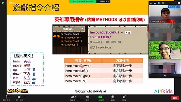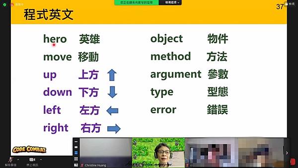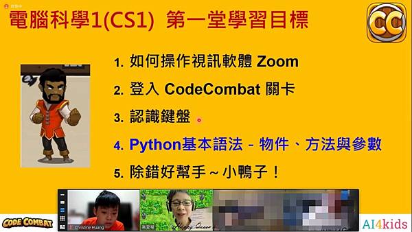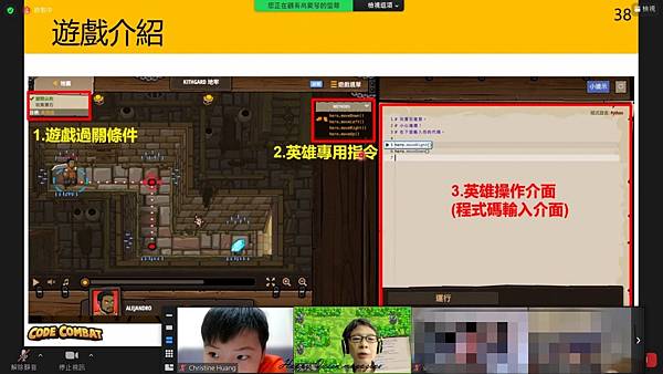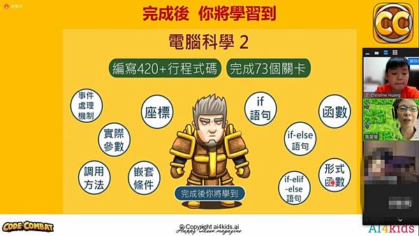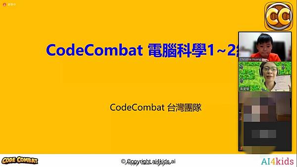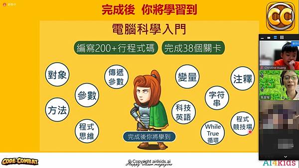 老師說明學習CodeCombat電腦科學1~2級,將會學到序列、演算法、語法、字串、參數、迴圈、變數、坐標、函數、事件、條件判斷式等重要項目