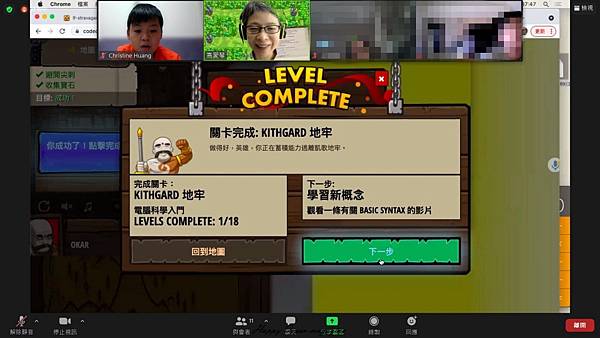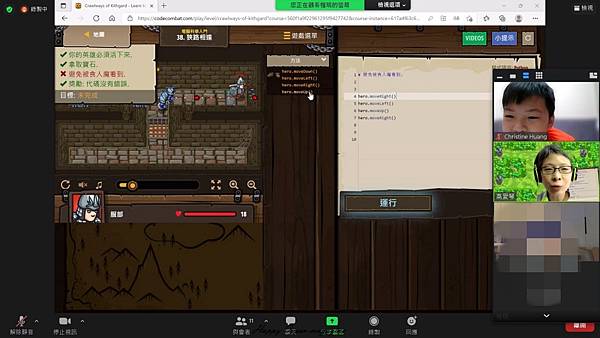 第一堂『CodeCombat兒童線上程式課』(1.5小時),在老師親切、專業、生動、耐心的循序漸進指導、線上同學的互動下,感覺很快就結束了,恩恩欲罷不能,很期待下一次的上課!