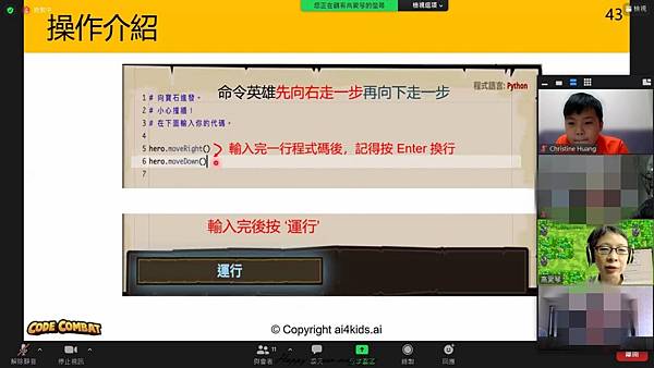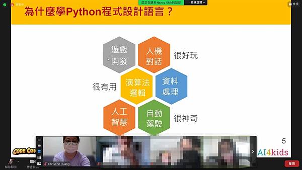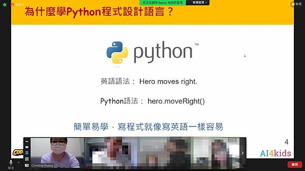 接下來老師介紹以Python基礎語法寫出程式碼,Python程式語言直覺、簡單、易懂,是全球最熱門的程式語言,能幫助強化兒童邏輯概念、資料統整、解決問題的能力,我覺得很適合初學者