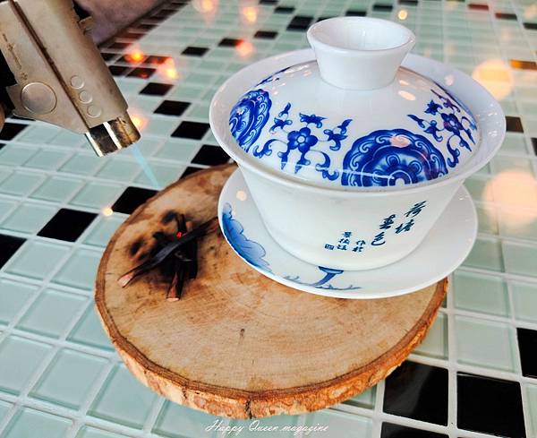 採用中式蓋杯盛酒,上桌時bartender點燃一旁的檀香木,讓人先聞香後品酒,很有創意,噱頭十足!