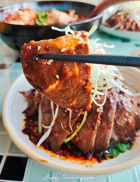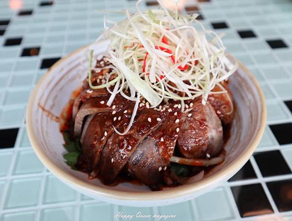夫妻肺片$450,擺盤像朵花,含有牛肚、牛腱、芹菜葉、特製麻辣醬、紅油、花椒油,雖是小辣口味,但吃完嘴唇一樣有點麻