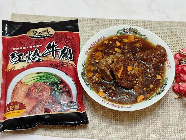 我把一包精緻紅燒牛肉冷凍湯料包,倒入鍋中加熱,再將整勺牛肉及湯汁淋到白飯上,剩餘小塊牛肉及湯汁,加水稀釋成牛肉湯,可以同時吃牛肉飯配牛肉湯,雙重美味享受!