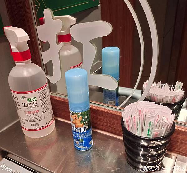 離開前去上洗手間,洗手台旁的架上陳列酒精、衣物香氛劑、牙線棒,讓人免費取用,好貼心!