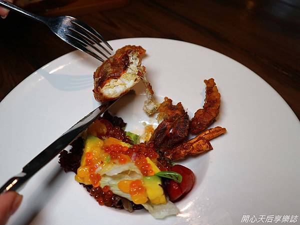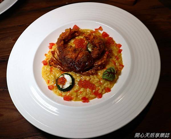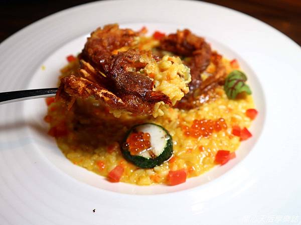以蟹黃、奶油為基底的燉飯並含有整隻現炸的軟殼蟹、櫛瓜、鮭魚卵、紅酸膜葉,創意十足!